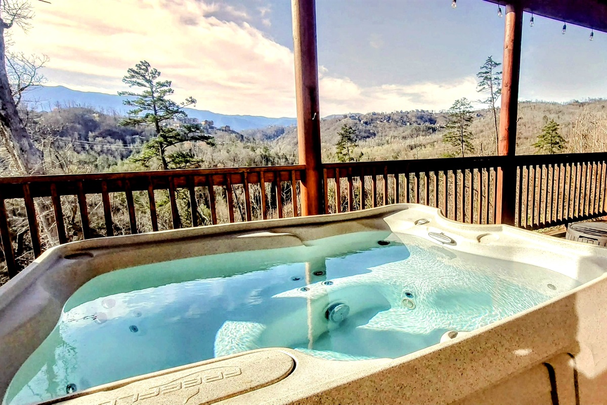 Newly built in 2018, this all adult chalet style 1200 sq ft luxury Gatlinburg cabin provides a "first floor" king suite with handmade sassafras furniture, flat screen "smart" HDTV and ROKU , spacious en-suite master bath and a private walk out to the covered deck and hot tub. Solid hickory flooring throughout cabin, custom log furniture, cathedral ceilings and large picture windows create an Adirondack theme throughout the cabin. The second floor offers a media room with flat screen "smart" HDTV and ROKU, double couple's recliner and large full bath. Kitchen amenities include a fully stocked custom kitchen with stainless steel appliances, granite counter top, cookware, bake ware, dish sets, and a new Keurig along with a new Mr Coffee maker. Enjoy magnificent mountain & ridge views from the privacy of the covered deck which includes a new custom spa with LED lights and a waterfall, a double glider rocker and a picnic table!